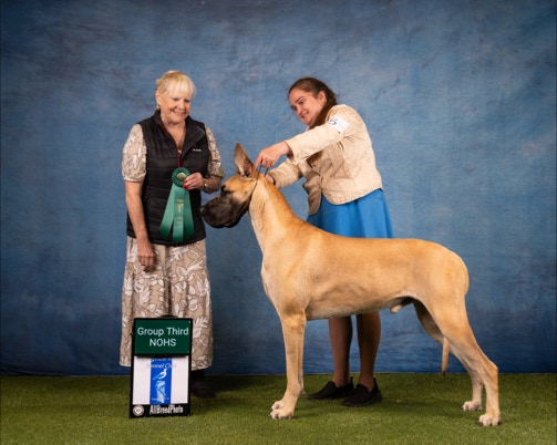 Sept 1,2025: Arthur continued to add to his award totals from the end of July to today with 3 BOB and NOHS BOBs, 4 BOS, 6 SD, NOHS Gr 3, and NOHA Gr 4. Mystic also continues to learn how to be a show dog,