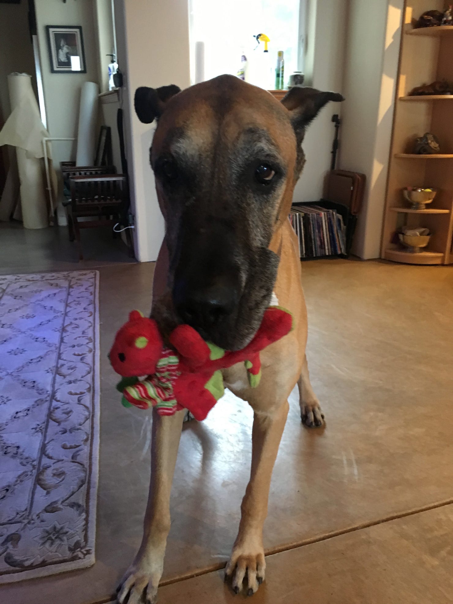 He kept his wonderful view of life up to the end - here he is with one of his favorite toys just after he was diagnosed with osteosarcoma. He was the reason Teulu’s Great Danes began and we will always remember him and rejoice in his legacy through his puppies. He was a true friend.