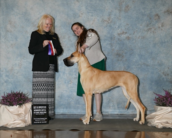 February 24, 2025. Arthur added more wins at the Rose City show with WD and BOW all four days!! He then picked up his first main line variety BOB at the Linn County show February 21. Mystic is starting to learn how to show and we look forward to her development.