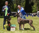 August 20: Arthur shows his stuff again. At the Enumclaw cluster (Sammish, Rainer Working Group, Olympic KC) he was awarded 1 RWD, 4 WD, 4 BOW, and 3 NOHS BOB. And we have now placed 7 of the Magic x Misty puppies.
